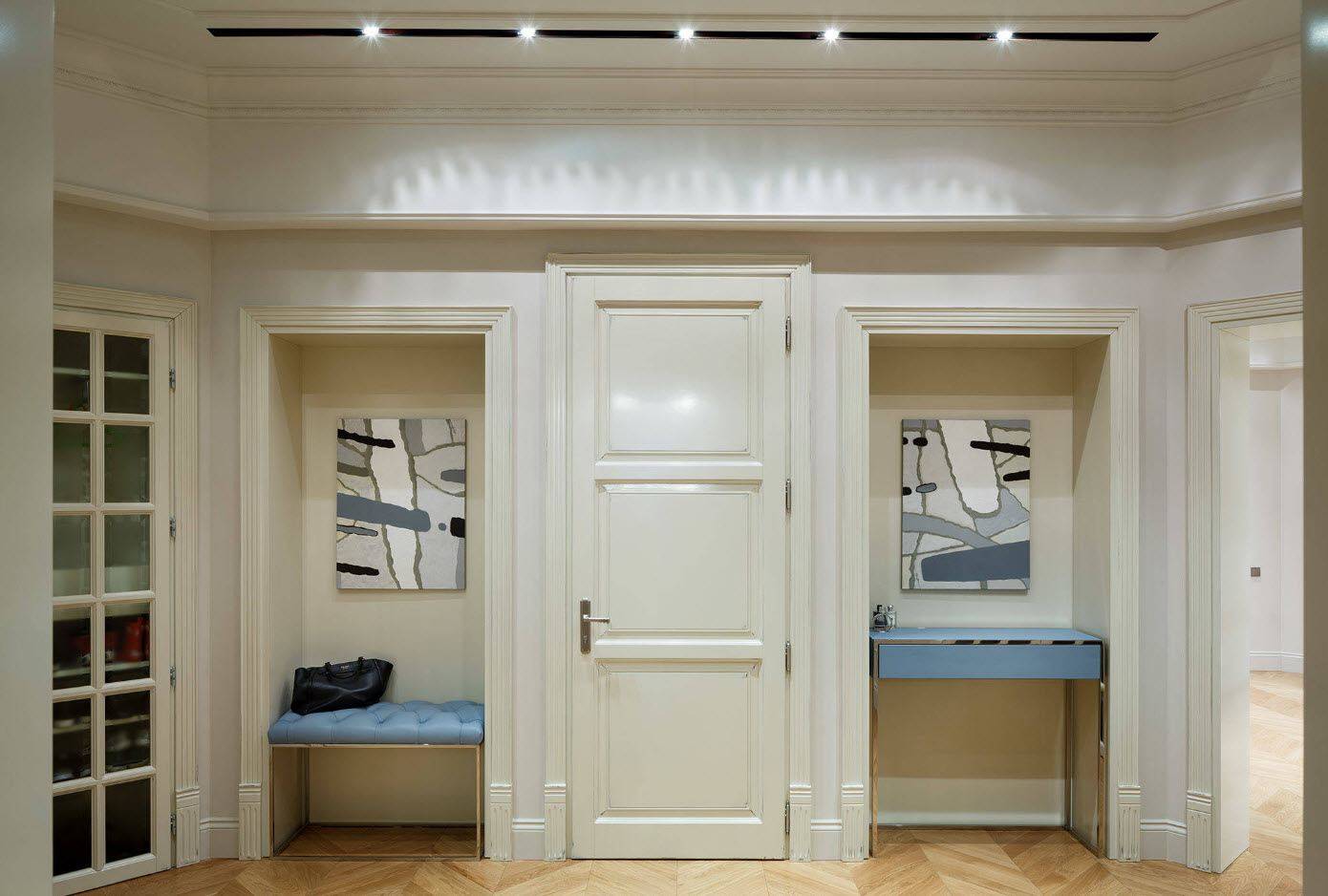 Из светлых тонов лучше выбрать нейтральные – серые, бежевые или коричневые. Этот вариант подойдет для скандинавского стиля. Если еще отделать стены деревом в контраст стен – то коридор станет весьма уютным. Для классического стиля и модерна подойдут пастельные голубые, розовые или зеленые. Нежная пастель прекрасно сочетается с белыми лепными элементами.