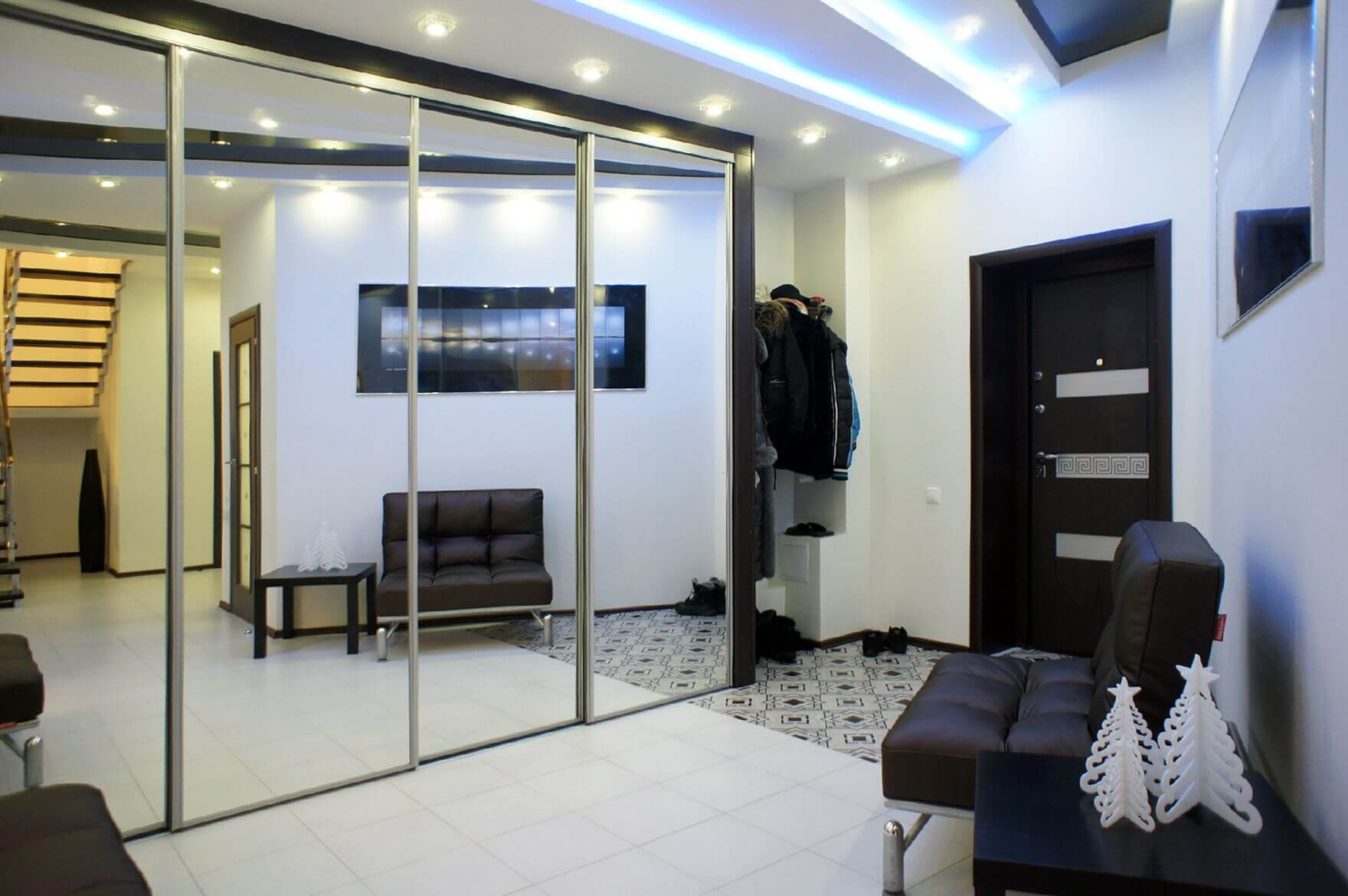 - В прихожих типа «купе» отлично будет смотреться зеркальный потолок или же натяжной из глянцевого материала. Если в квартире/доме потолки не отличаются высотой, то такой же вид отделки можно использовать и для коридора-коробочки, и для «норки с отнорком».