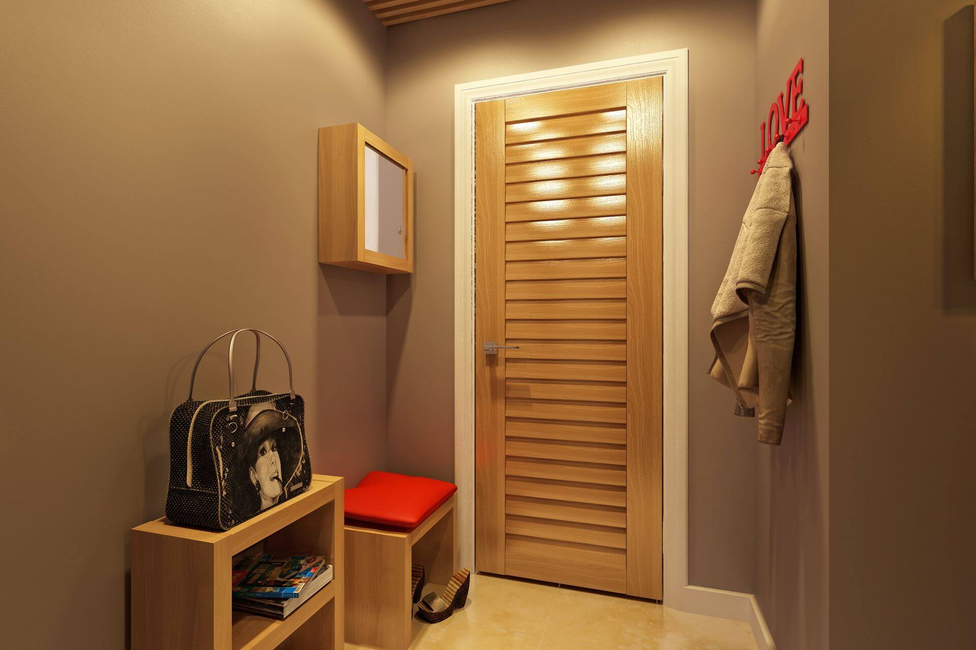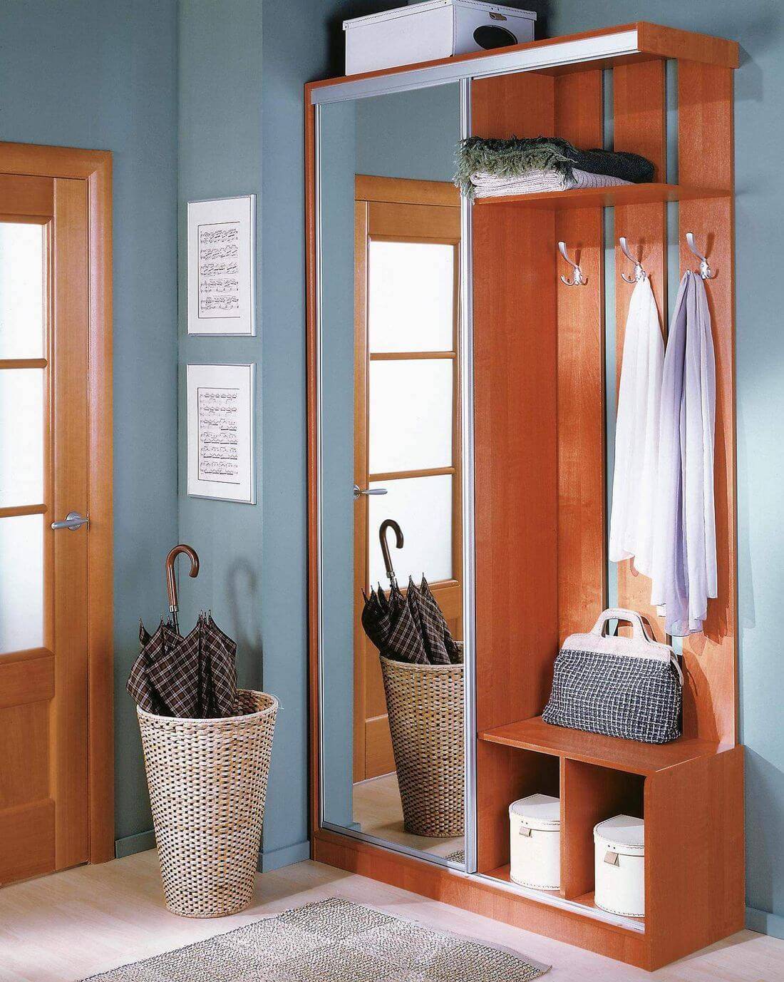 Маленькая прихожая, в которой еще и все двери, к тому же, открываются вовнутрь нее, дает очень мало простора для фантазии. Здесь лучше руководствоваться правилом «меньше, да лучше». Расположите у входа самые необходимые элементы — вешалку для сегодняшней верхней одежды, зеркало и пуф для обувания или очень тонкую обувницу, если хватит места. При этом помните — ближе ко входу, если ниши для углубления мебели совсем нет, располагайте максимально узкие предметы.