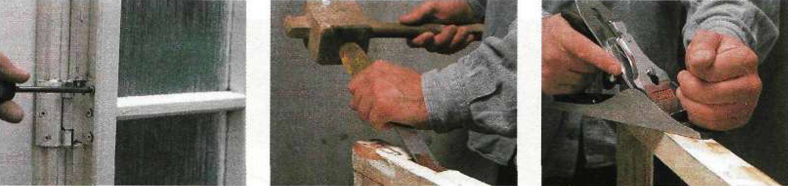 В первую очередь снимаем створки, убираем штапики или стамеской бережно отковыриваем замазку и вынимаем стекла. Потом целиком убираем фурнитуру (она все равно потребуется новая); древесные отливы (слезники) с внешних створок бережно снимаем: они на гвоздях, какие наверное проржавели. Также вытаскиваем и все остальные гвозди, убираем стальные угольники – для последующей работы в раме и створках должно остаться только дерево.