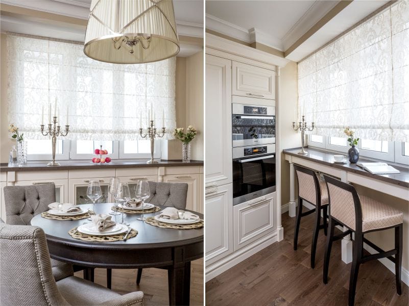 - Если на кухне окно совмещено с балконной дверью, то вы можете повесить два полотна, как показано в следующем изображении.