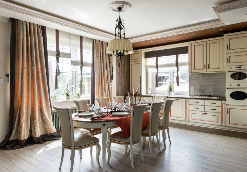 Для кухонь-столовых, оформленных в старинных стилях, подбирают занавески из атласа, шелка или комбинации нескольких тканей с использованием пышных оборок, кисточек или бахромы. А с роскошными гардинами и оригинальным ламбрекеном можно добиться оживления нарочито простого дизайна.