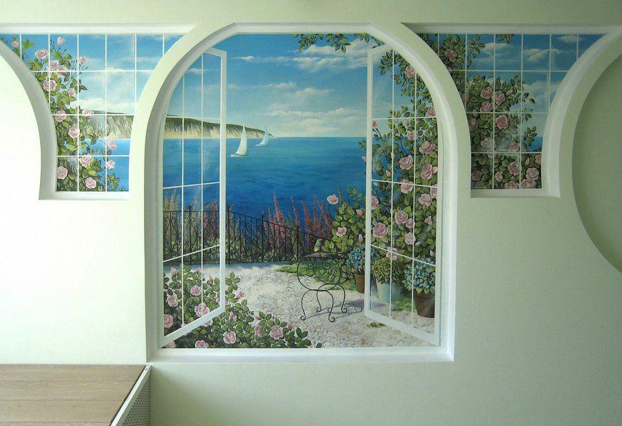 Изображение окна, облаков, дерева визуально расширяет пространство. Ветвистое дерево или виноградная лоза, нарисованные на стыке двух стен с «перетеканием» через угол, создают необычную перспективу. Необычно смотрятся модернистские и символические рисунки на стенах. Фото для образца можно найти в Интернете.
