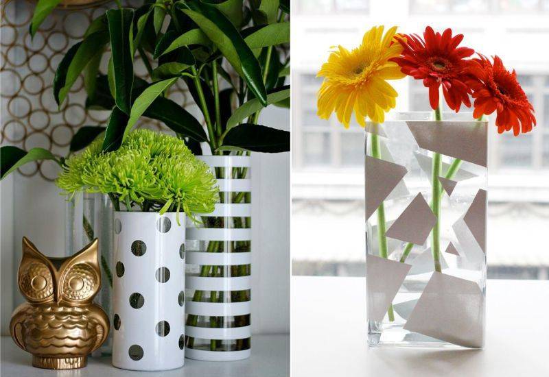 Помимо вышеперечисленных способов изготовления и украшения ваз ручной работы есть еще много интересных вариантов декора. Рисунок можно нанести с помощью трафарета из обычной изоленты, как показано на фотографии – получится бутылка с замысловатыми полосками, как в одном направлении, так и в разных. Для детей хорошей тренировкой мелкой моторики будут вазы, оформленные подручными сыпучими материалами или макаронами, камешками или ракушками. В случаях обматывания атласными лентами очень смело выглядит вариант с использованием вместо них каната.