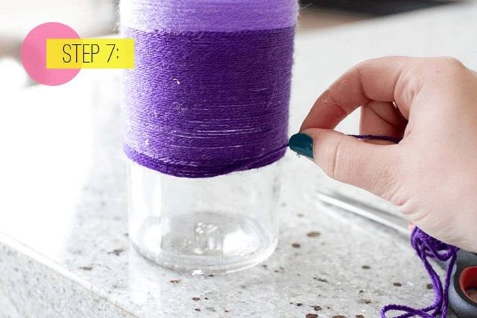 Чем хорош этот отделочный материал, так это тем, что он разноцветный и создавать шедевры ручной работы, украшая емкости, очень просто. Пряжа легкая и быстро приклеивается. К тому же ее можно не садить на клей, а просто плотно обкрутить вокруг всей поверхности тары, и посадить на клей только кончики нити.