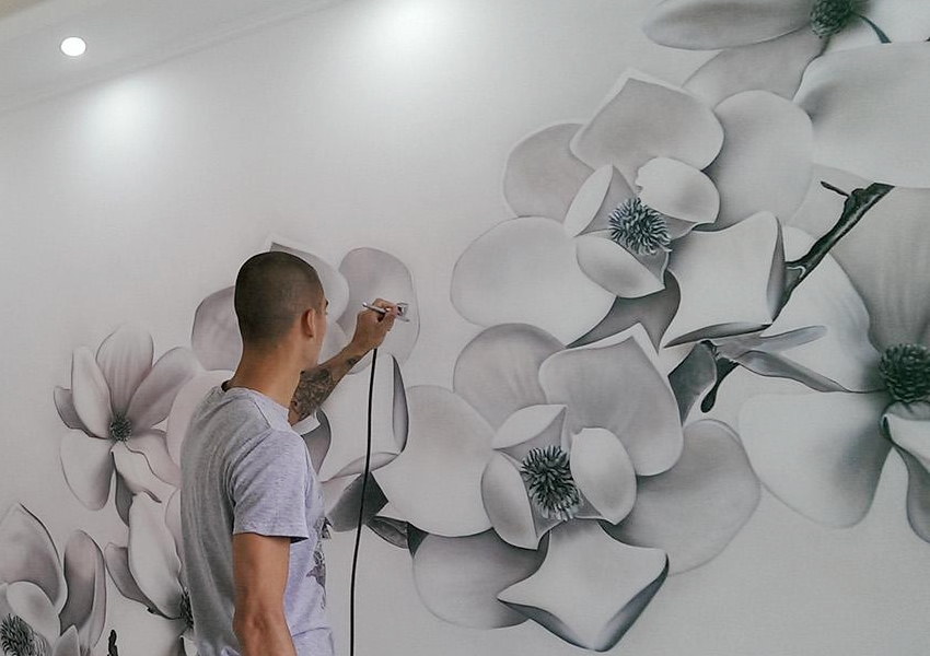 - аэрография. Изображения появляются на стене при помощи специально прибора. Аэрограф позволяет расставить мельчайшие акценты, благодаря чему создаются яркие, реалистичные и объёмные рисунки. Его можно использовать для разных поверхностей. Водорастворимый акрил хорошо ложится на штукатурку, гипсокартон, обои, бетон и проч.;