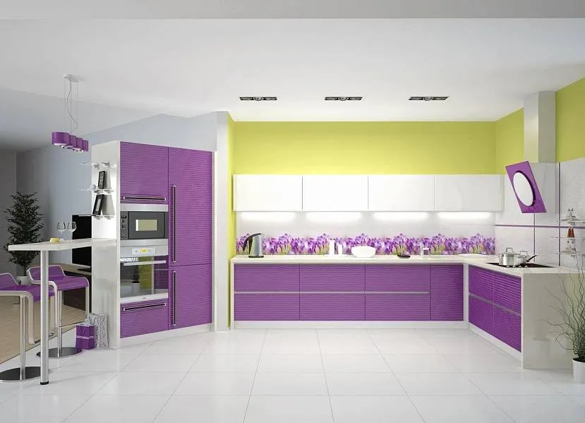 Если же окна кухни выходят на юг, то вы можете выбирать холодные тона: лавандовый, малиновый, маджента, фуксия и пр. как на следующих фото.