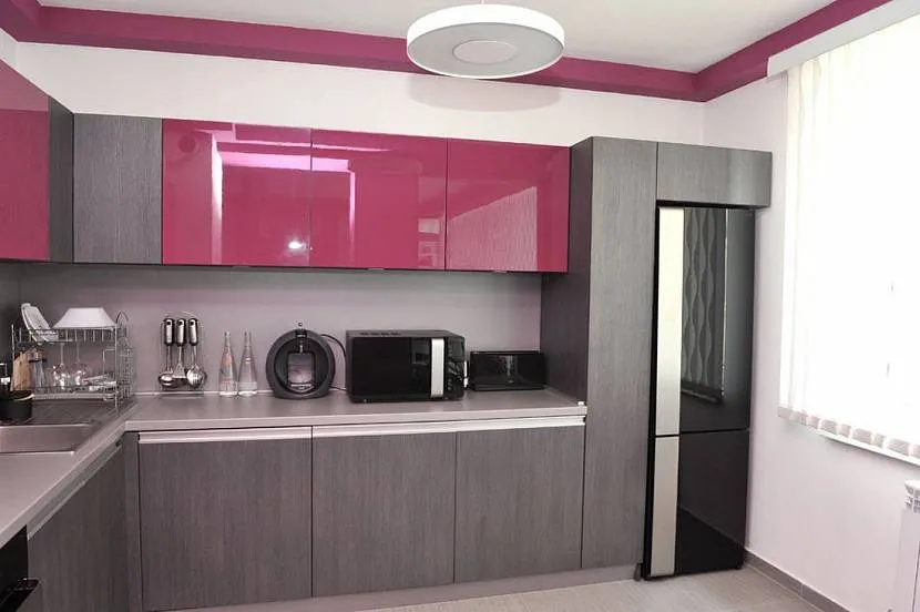 Ярко-розовые фасады лучше сочетать с другими цветами, что бы разбавить и смягчить их.