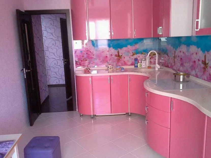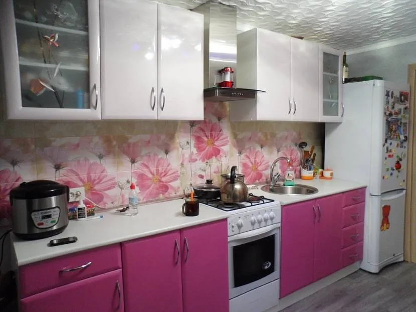 Добавить этот цвет в интерьер кухни можно и при помощи кухонного фартука. Розовый фартук на кухне может быть из керамической плитки, закалённого стекла (скинали) и даже прочных обоев для кухни.