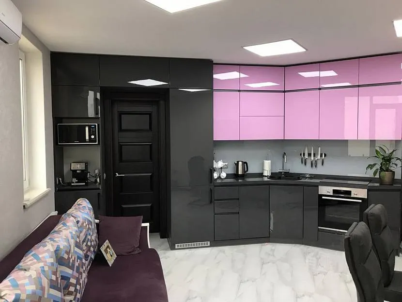 Идеальный вариант обустройства интерьера розов-черной кухни в стиле гламур: розовые обои с черным орнаментом, глянцевые ярко-розовые фасады мебели, бытовая техника цвета металлик, столешницы и фартук темно-серого цвета, текстиль в черно-розовых тонах, пол из керамогранита темно-серого цвета, либо черный наливной пол.