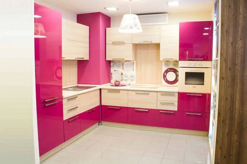 Оттенки могут варьироваться от грязно-розовых, дымчатых до ярких и насыщенных. Таким образом подобная расцветка способна придать кухне невинный и изящный, благородный и роскошный или томный и загадочный вид.