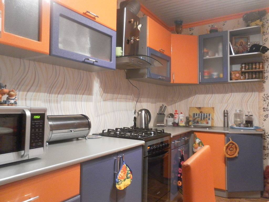 Синий и оранжевый — достаточно приятное для глаз сочетание оттенков. Синий тон в данном случае будет выглядеть менее холодным, поэтому кухня будет уютной и теплой. Оба тона при обустройстве интерьера разрешается использовать примерно в равных пропорциях.