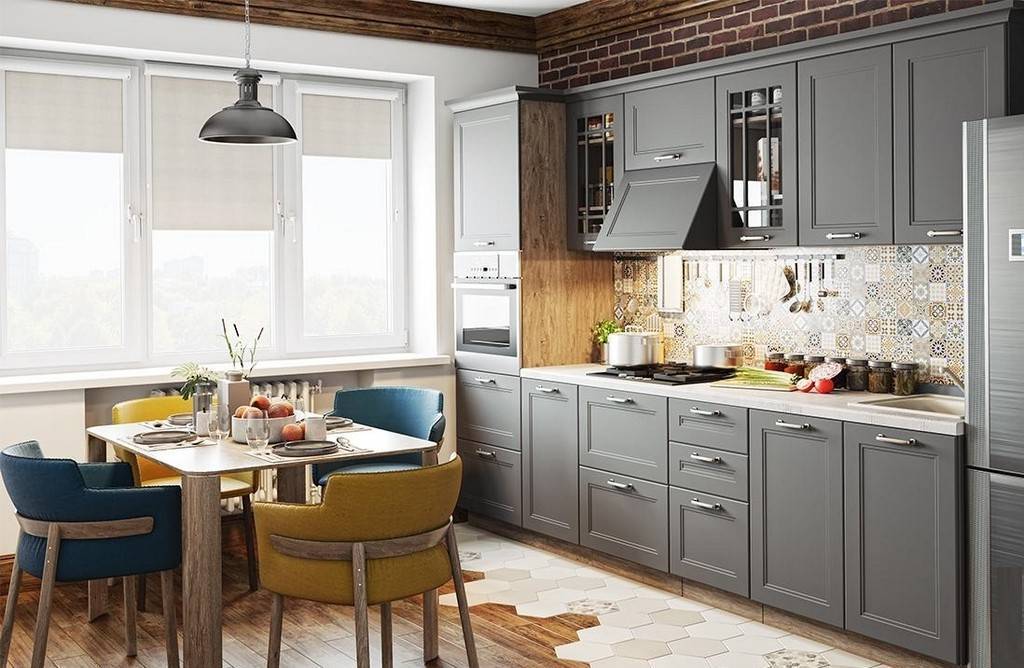 Стол, шкафы и стулья можно выбрать оригинальной формы. Серый пол будет хорошо сочетаться с розово-серым фартуком. Серыми могут быть и некоторые кухонные аксессуары, а также фурнитура.
