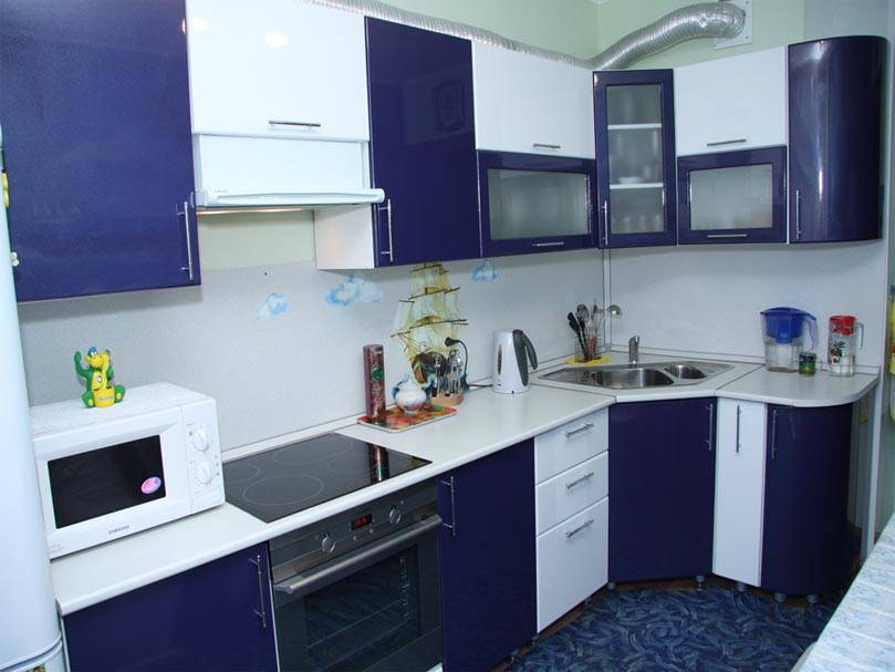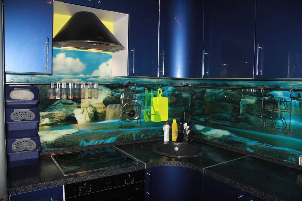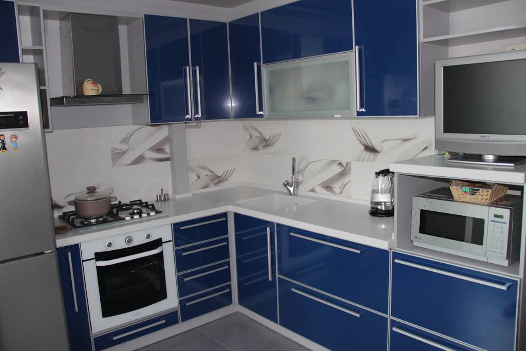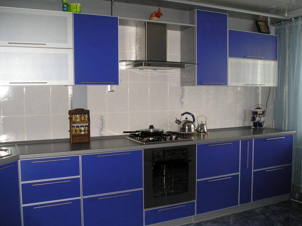 Наибольшей популярностью пользуется вариант оформления, в котором белые стены, столешницы и фартук соседствуют с синими фасадами гарнитура. Это очень гармоничное сочетание, благодаря которому кухня выглядит дорого и стильно.