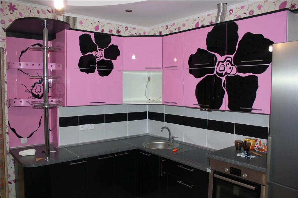 На фото — кухня с розовым оформлением с черными аксессуарами.