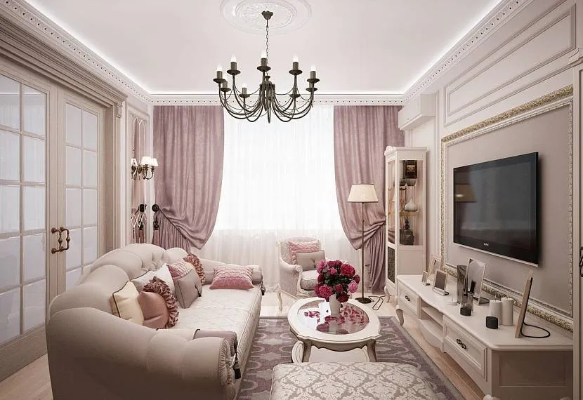 На фото гостиная комната в стиле неоклассика. Обивка мягкой мебели выполнена из пыльно-розового бархата.
