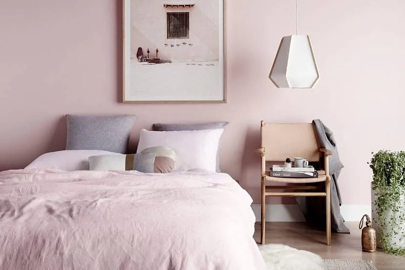 - Пудровые оттенки хорошо подходят для спальных комнат.