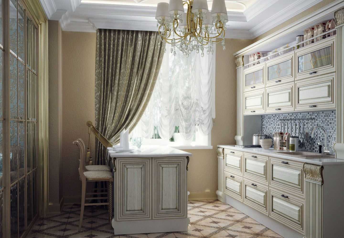 Тканевые шторы, расшитые золотыми нитями и органза с тончайшими узорами великолепно впишутся в необычный дизайн.