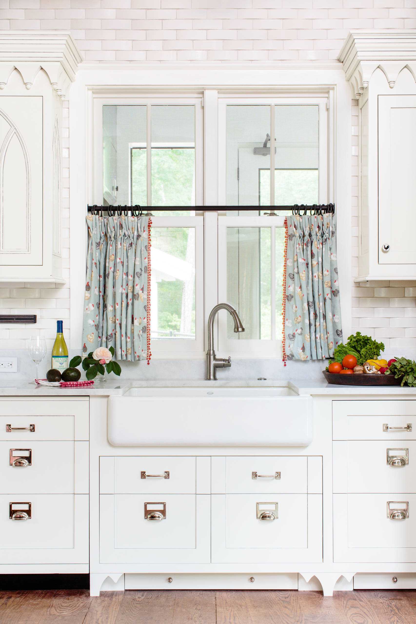 Объедините одним орнаментом шторы, несколько предметов кухонной утвари (например, разделочную доску и подставку под горячее), добавьте пару элементов подобного декора на стену, сварите хороший кофе, поставьте в духовку круассаны, и voilà – вы уже создали на своей кухне уютную атмосферу французской деревни.