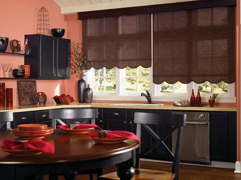 - теплые цвета рулонных штор на кухню подойдут в комнату без солнца: терракотовый, бежевый, оранжевый, желтый, красный, персиковый, розовый.