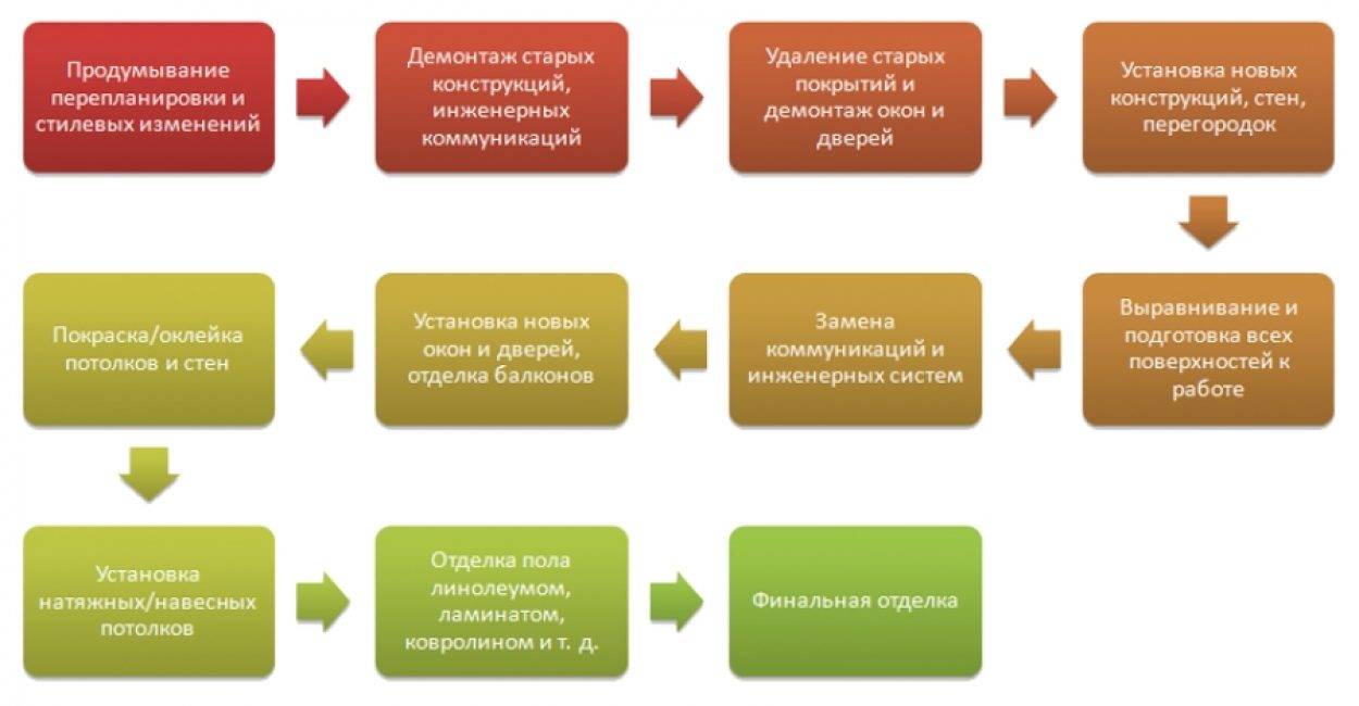 - Полный – из голой коробки делают квартиру, т.е. разводят коммуникации, формируют стяжку пола, устанавливают перегородки, отделывают.