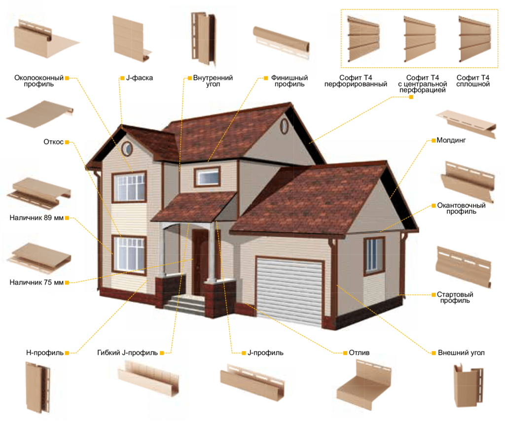 Сайдинг складывается из панелей (планок), имеющих вытянутую форму, имеющих перфорированную кромку и замок-щелку, который служит для соединения секций. В настоящее время планки бывают: