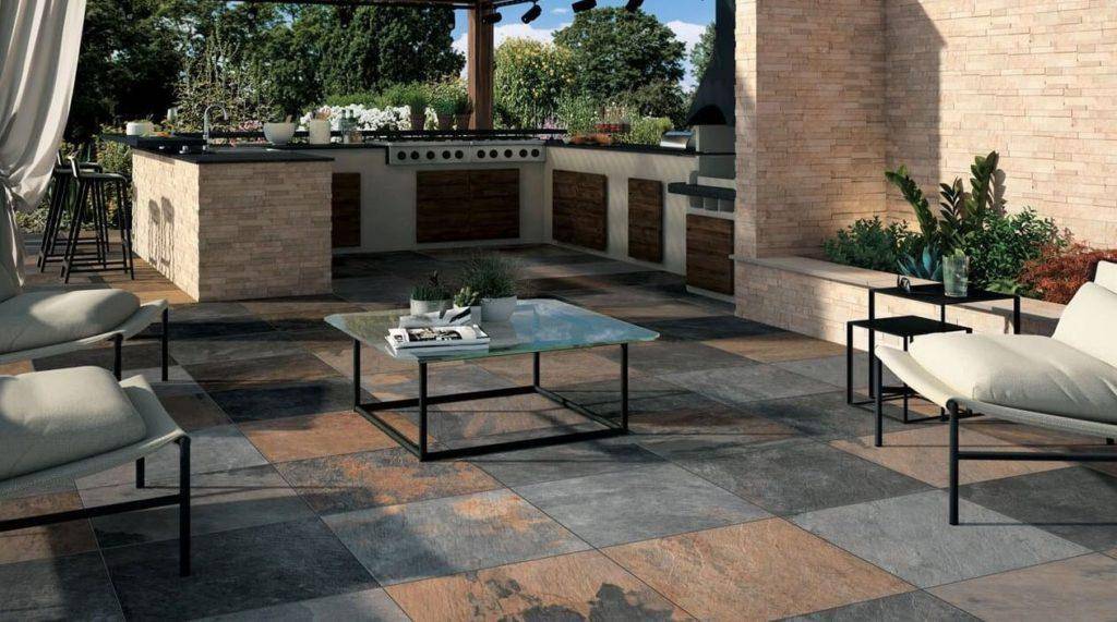 Керамогранитная плитка также является оригинальным решением для отделки пола. Некоторые используют керамогранитную плитку и для отделки стен беседки из кирпича. Например, ей можно обработать рабочую поверхность мангала, если таковой имеется внутри беседки. Керамогранит устойчив к механическому воздействию, а также не подвержен гниению. Стоимость на керамогранитную плитку немалая, поэтому не каждый сможет ее приобрести. Более того, предварительно следует изготовить качественный и ровный бетонный пол. После монтажа плитки на пол, все швы следует обработать влагонепроницаемой затиркой, чтобы исключить вероятность проникновения влаги внутрь стяжки.