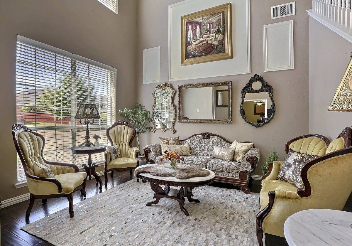 В старинных интерьерах эффектно смотрятся горизонтальные комбинации с участием светлых и темных обоев. Обои с цветами на белом фоне можно совместить с черными, коричневыми, бордовыми и другими покрытиями на нижней части стен, а границу оформить молдингами или бордюрами.