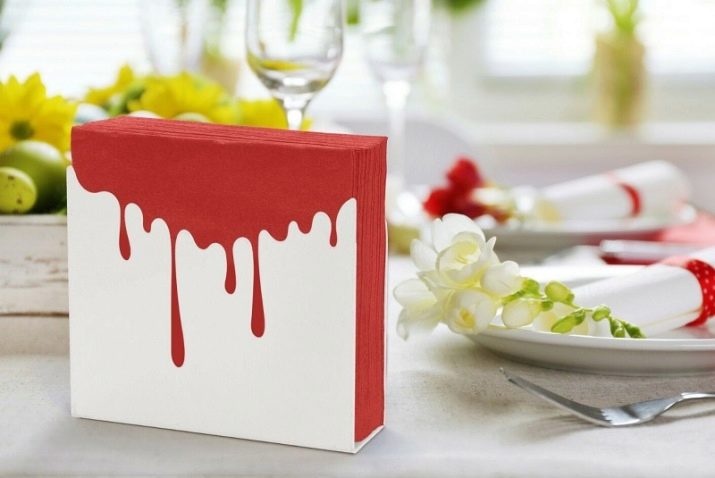 Изделия в таком дизайнерском оформлении считаются довольно эффектными. Чаще всего для фона салфетниц выбирается белый цвет. Боковые стенки изделия имеют неровный край, поэтому если вложить красные салфетки, то можно получить эффект кровавых подтеков.