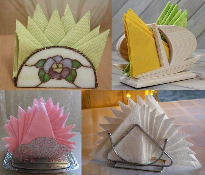 Салфетками необходимо пользоваться в праздничные моменты и при обычном приеме пищи. Для повседневного использования есть подставки, не требующие определенных умений для быстрого складывания. Достаточно вынуть изделия из упаковки и уложить их туда. Некоторые модели оснащены держателем, обеспечивающим им сохранение формы и аккуратности.