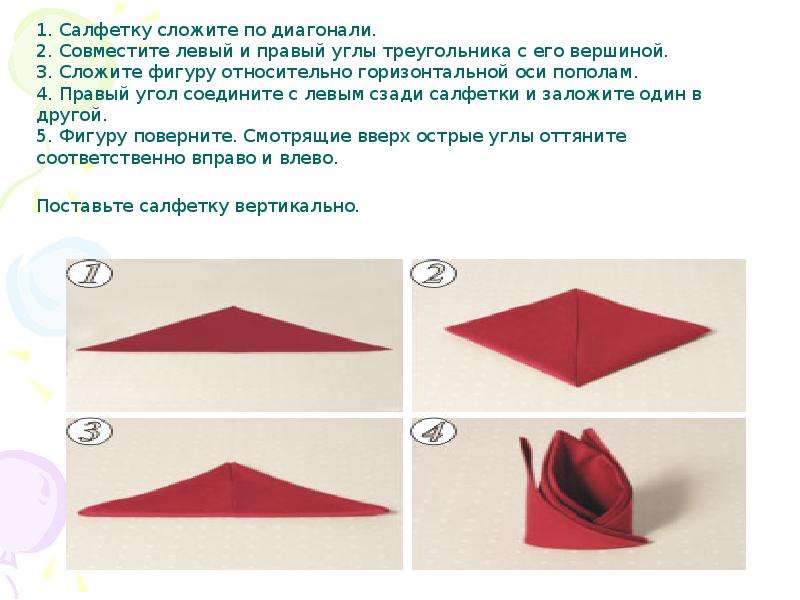 - сначала сделать загибы двух противоположных углов салфетки, после чего сложить ее по диагонали;