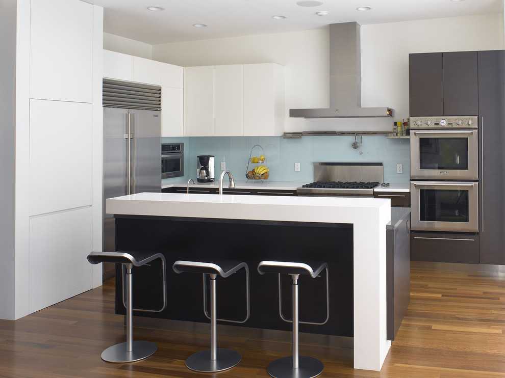 В современных интерьерах кухня перестает быть кухней в привычном понимании. На сегодняшний день кухня визуально становится часть стены, именно поэтому навесные шкафы доводят до самого потолка, а ручки шкафов становятся интегрированными в фасад