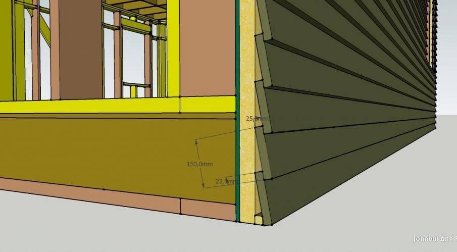 Зазор для вентиляции между стенкой и деревянной обшивкой должен составлять 4-5 см. В нем будет образовываться поток восходящего воздуха, который способен выводить влагу.
