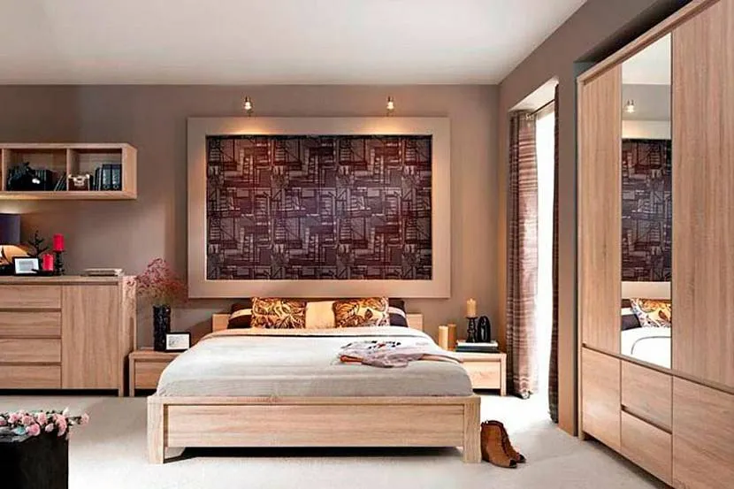 Кровать из массива ясеня в спальне цвета кофе с молоком