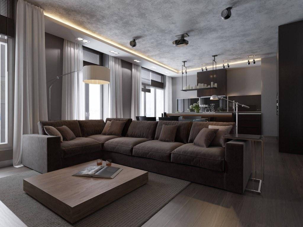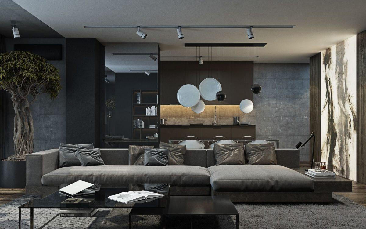 Если гостиная достаточно просторная, для неё подойдёт как монохромное серое оформление, так и сочетание нескольких оттенков разной светлоты. Зонирование в кухне-гостиной с серыми стенами может выполняться как раз за счёт окрашивания стен в двух близких оттенках одного цвета.