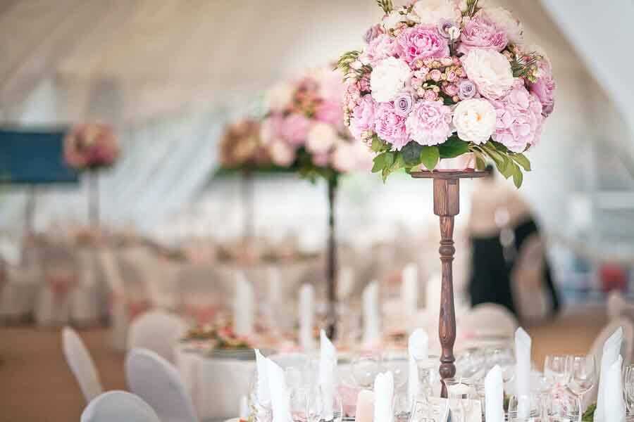 Можно при оформлении стола соорудить вот такие высокие подставки под цветы, благодаря которым букеты точно не будут мешать дегустации блюд