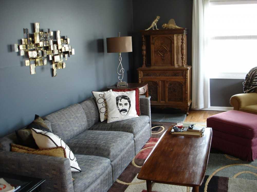 Эффектно выглядят одиночные предметы мебели в таком цвете, которые необходимо поддержать небольшим количеством декоративных предметов. Это может быть несколько небольших ваз или плафон светильника. В менее смелых интерьерах серый присутствует лишь в качестве небольших акцентов. Например, на фоне светлой обивки используют подушки с серыми наволочками. Или на фоне яркой стены располагают серое кресло. Такой прием помогает немного смягчить влияние насыщенных оттенков и успокоить их. Любой вариант использования оттенков серого цвета в гостиной будет придавать желаемое спокойствие и благородство ее интерьеру.
