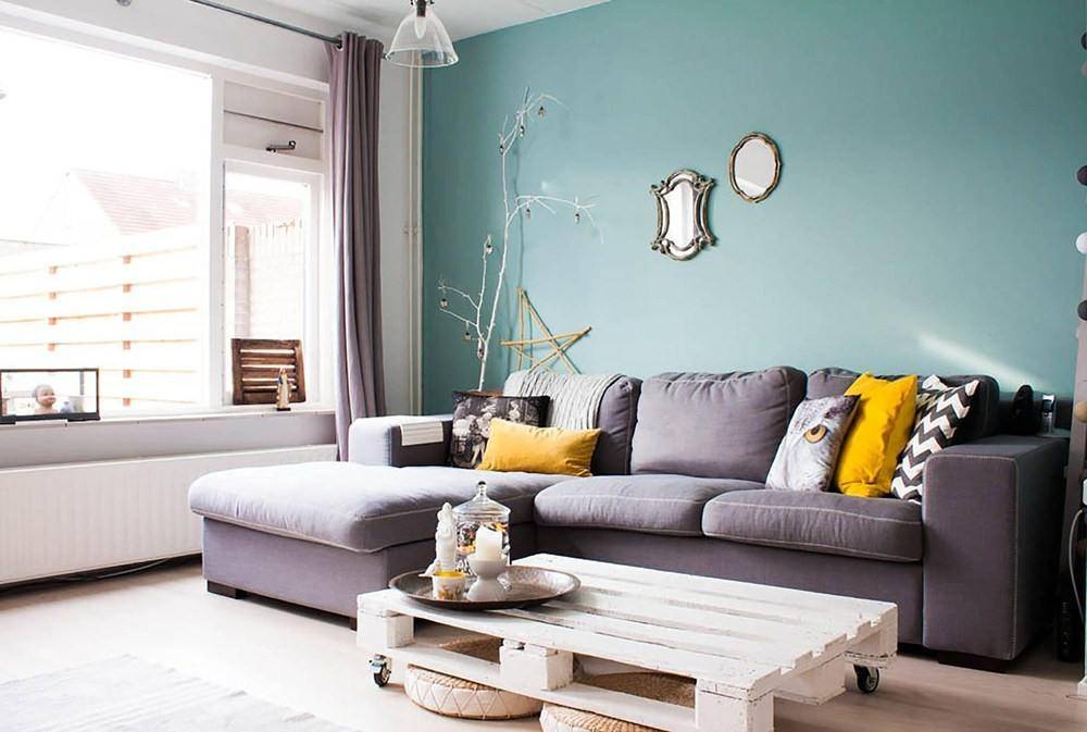 - Интерьер гостиной с серым диваном хорошо освежают ярко-синие тона и бирюза. Такое сочетание можно назвать природным, умиротворяющим. Цветовая гамма текстиля (шторы, балдахины, покрывала) будет способствовать созданию атмосферы гармонии и отдыха.