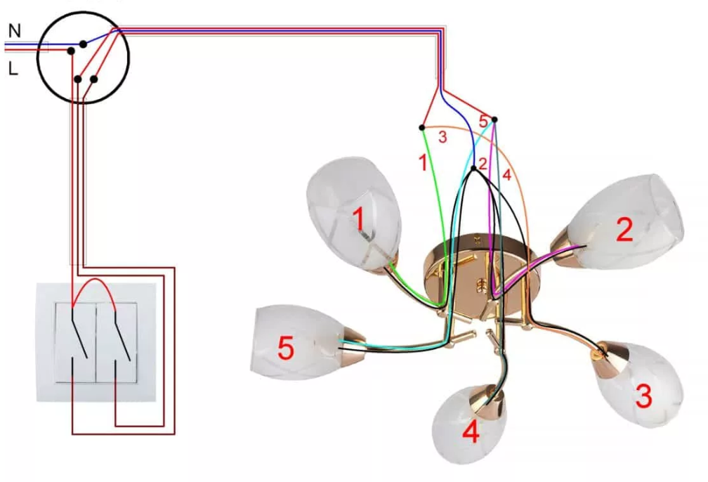 Подключение пятирожковой люстры к двойному (двухклавишному) выключателю