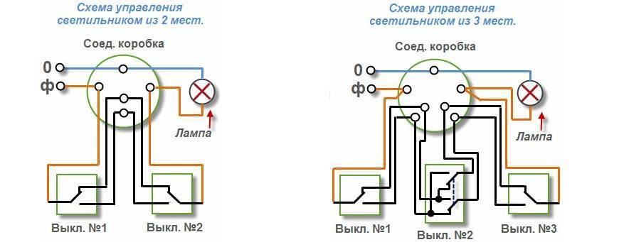 Именно поэтому возникает вопрос, как сделать возможным включение лампочки сразу с двух и более мест? Поделиться с друзьями: Вам также может быть интересно. Рассмотрим принцип действия данных устройств согласно следующему фото: В данной схеме смонтировано: источник питания В фаза и ноль ; распределительная коробка, в которой выполняется коммутация; 2 группы цепей освещения для примера это может быть люстра и светодиодная подсветка в зале или комнате. Схема управления двумя отдельными светильниками из четырех точек Как мы уже заметили, схему управления освещением можно наращивать бесконечно.