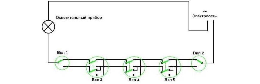 В подобной схеме на первой и последней точке управления освещением применяются обычные проходные выключатели, тогда как на всех остальных пунктах задействуются перекрестные переключатели. Число мест управления группами осветительных приборов неограниченно, но с каждой дополнительной точкой осложняется расключение в распредкоробке вследствие большого количества проводов. Для облегчения работ необходимо промаркировать провода, чтобы впоследствии не запутаться в них.