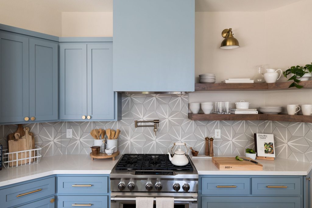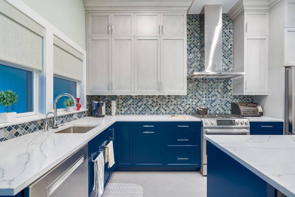 Для дизайна синей кухни, имейте в виду, что этот цвет наиболее предпочтителен для мужчин, поскольку это может показаться довольно консервативным и традиционным. Также исследования показывают, что люди более продуктивны в синих комнатах, это любимый цвет людей для рабочих зон, таких как домашние офисы… и кухни!