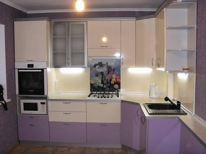 Сиреневая кухонная стенка станет изюминкой интерьера. Гарнитур может быть как приглушённого, так и яркого цвета. Уравновесить сочную расцветку фасадов можно с помощью столешницы и фартука белой расцветки. Для маленькой площади рекомендуется подбирать гарнитур с глянцевой поверхностью, а для большой — с матовой. Фото бело-лилового кухонного гарнитура можно увидеть ниже.