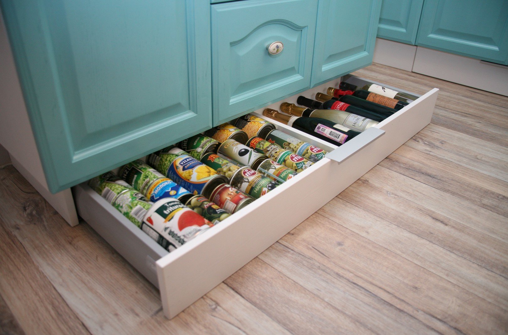 Цокольные ящики. Для тех, кто ценит порядок в кухонных шкафах, идея устройства ящика в цоколе гарнитура покажется как минимум, заманчивой. Ящик заменяет декоративную планку и подходит для хранения плоских предметов: больших блюд, кондитерских форм, противней.