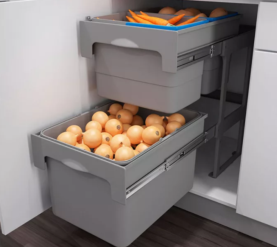 Еще одна полезная идея для установления порядка на кухне — покупка мебели со встроенными ящиками. Такие полки в шкафу подходят для хранения сыпучих продуктов на кухне в банках, упорядочивания кастрюль и сковородок.