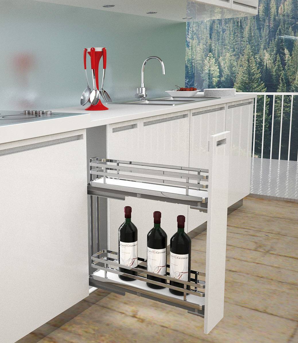 Порядок на кухне в шкафах можно организовать, если установить выдвижную бутылочницу. Выглядеть она может как высокий шкаф-колонна. Часто в бутылочнице хранят бутылки вина, бокалы для вина или других напитков, масло, банки с джемом или соусами.