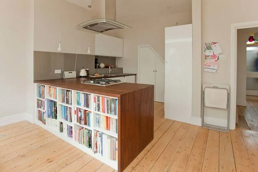 В данном интерьере невысокий стеллаж входит в состав выступающие части кухонного гарнитура. Такое решение позволяет отделить рабочую зону от столовой, выберите место для хранения книг или другого декора.