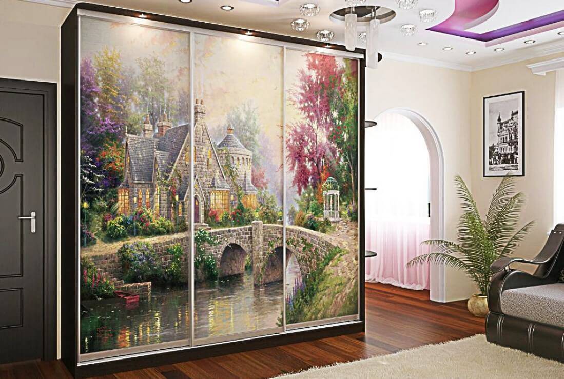 - Фасад шкафа-купе часто украшают фотопечатью. Картинка выбирается любая — от фото до репродукции знаменитого живописного шедевра. Так мебель дополнит любой по стилю интерьер.
