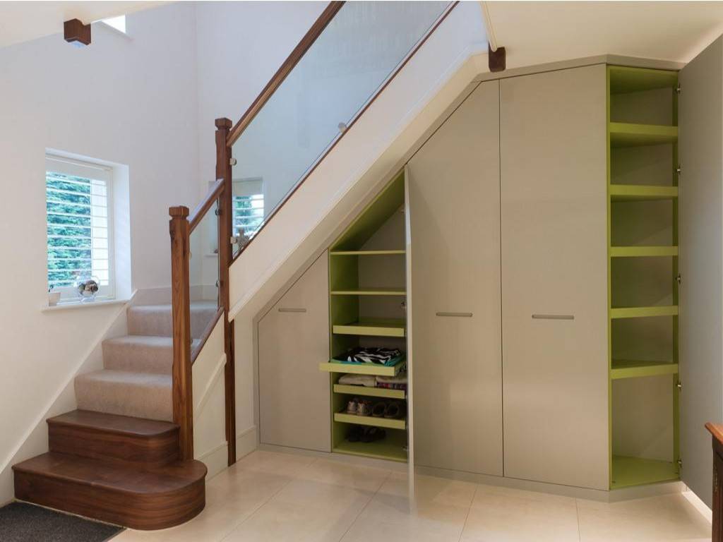 - Место для хранения вещей. Минимальная ширина лестницы — 80 см, на 20 см больше глубины стандартных шкафов. Даже если учитывать наклон пролета, во встроенный шкаф помещается большое количество вещей.