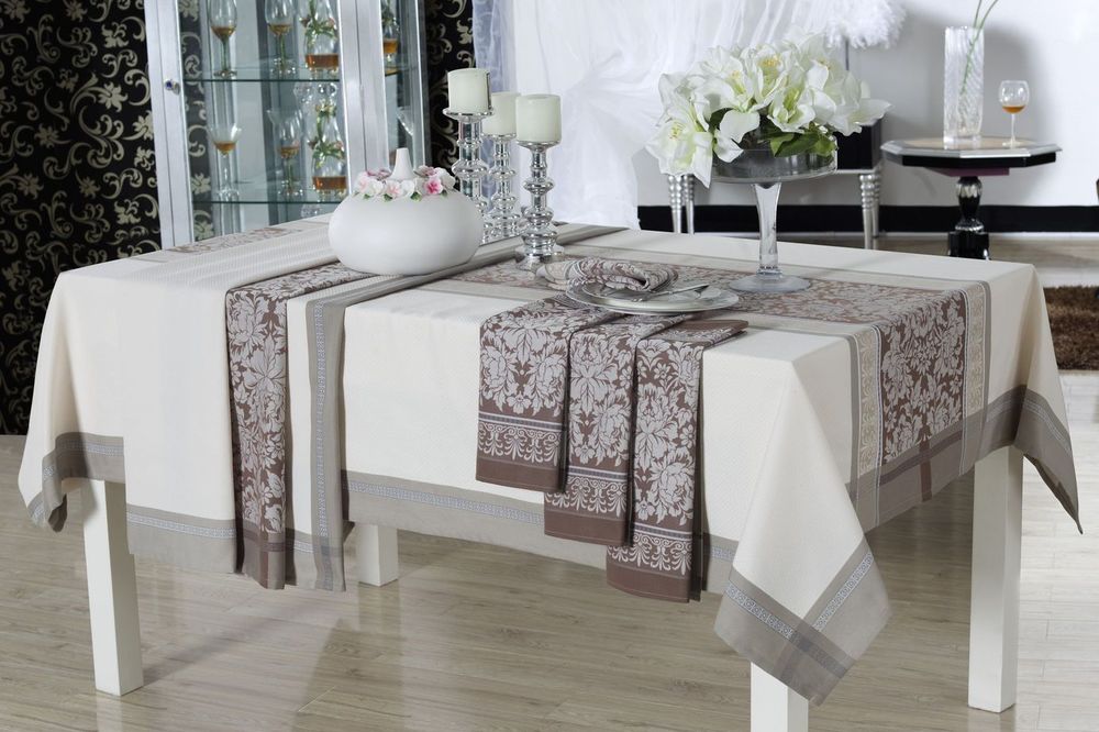 Это очень фактурный, но при этом легки и нежный материал, который всегда смотрится элегантно и солидно. Часто такие скатерти украшают вышивкой, рельефным рисунком или другим декором.